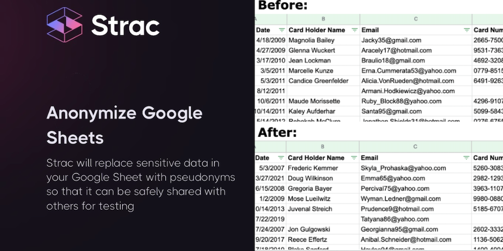 Strac protects businesses by replacing sensitive data like account numbers, email, salary, credit card, address and more with format preserving pseudonyms in Google Sheets. You can safely perform test