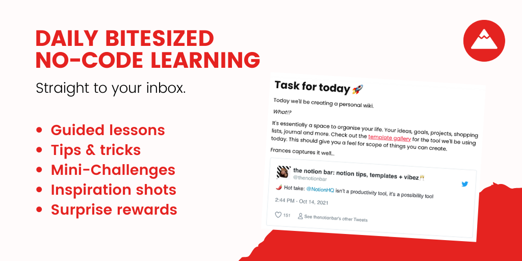 Learn to no-code by committing to the 100DaysOfNoCode challenge. It has 3 rules: 1. Publicly commit 2. Learn to no-code for at least 30 mins every day 3. Share your progress Get free daily lessons str