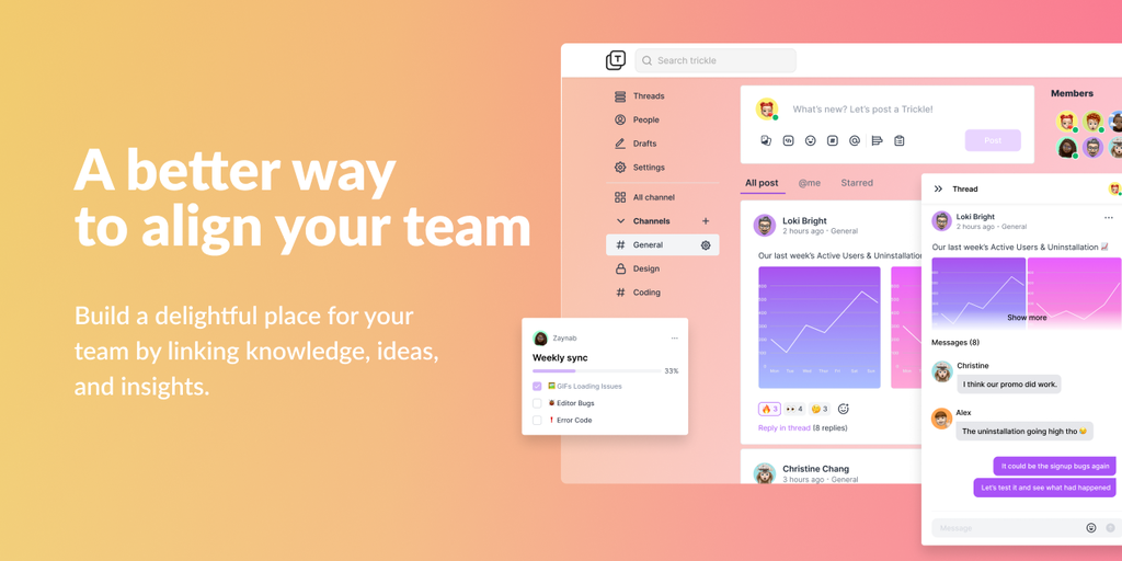 Trickle is a unified workspace where your team can collaborate, communicate and hang out. With news feed, embeds, live threads, and reactions, everyone can voice their ideas and have fun at work.