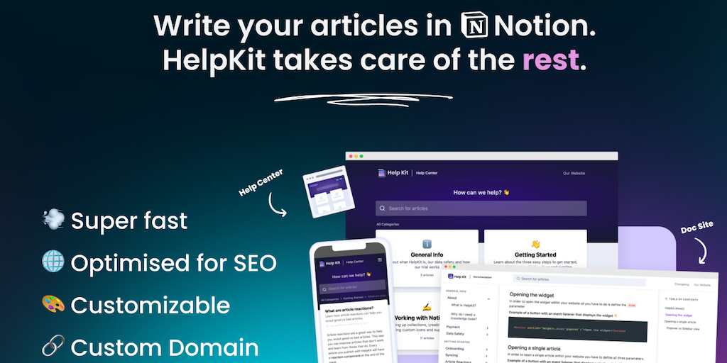 Write your help articles in Notion and HelpKit takes care of the rest. HelpKit offers an embeddable widget, help center or documentation layout, full-text search, analytics and much more. Deliver inst