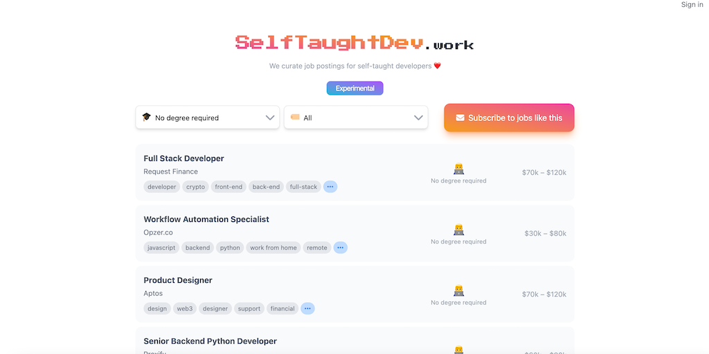 SelfTaughtDev.work - Curated job postings for self-taught devs on your inbox | Product Hunt