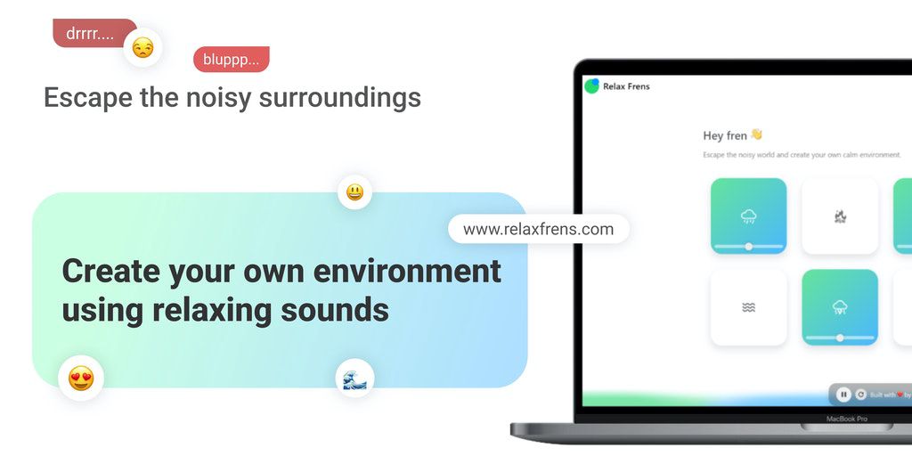 RelaxFrens helps you escape the noisy surroundings and create your own environment using relaxing sounds 🌳🌊 so you can be productive at work, study to ace your exams, practice yoga/meditation or just