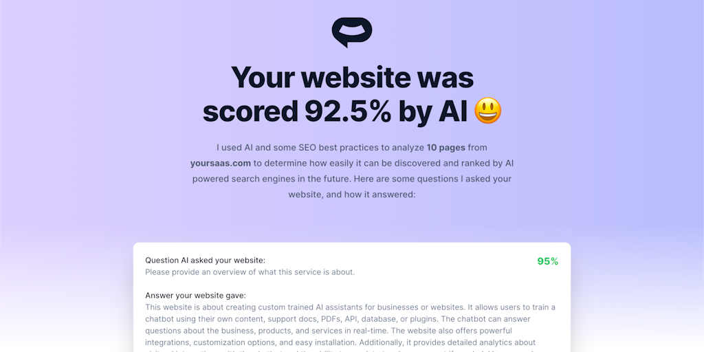 Find out if your website can be discovered and ranked by AI powered search engines in the future. AI Score My Site will index your site, formulate questions and see how your website answers, then make