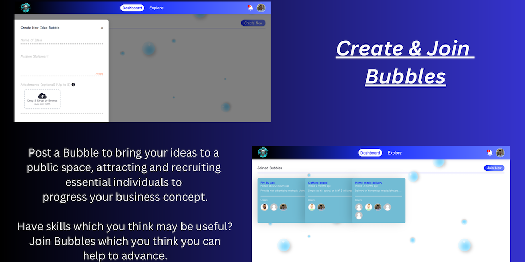 Share your ideas, find your team, reach your goals! Idea Bubble is here to connect you with like-minded individuals, bringing ideas and skills together under one platform. Create a group of profession
