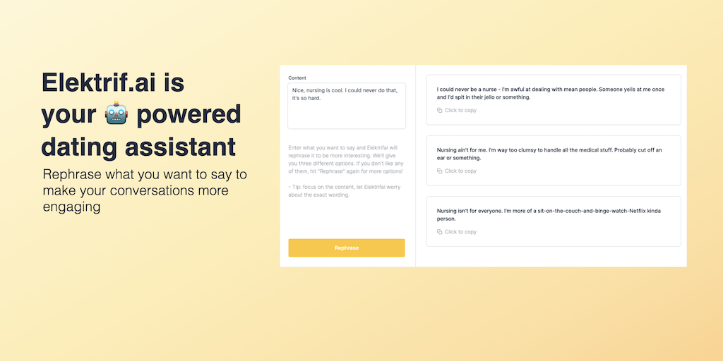 Online dating can be time consuming and exhausting. Elektrif.ai uses GPT3 to generate personalized conversation starters, rephrase your messages to be more engaging, and more.