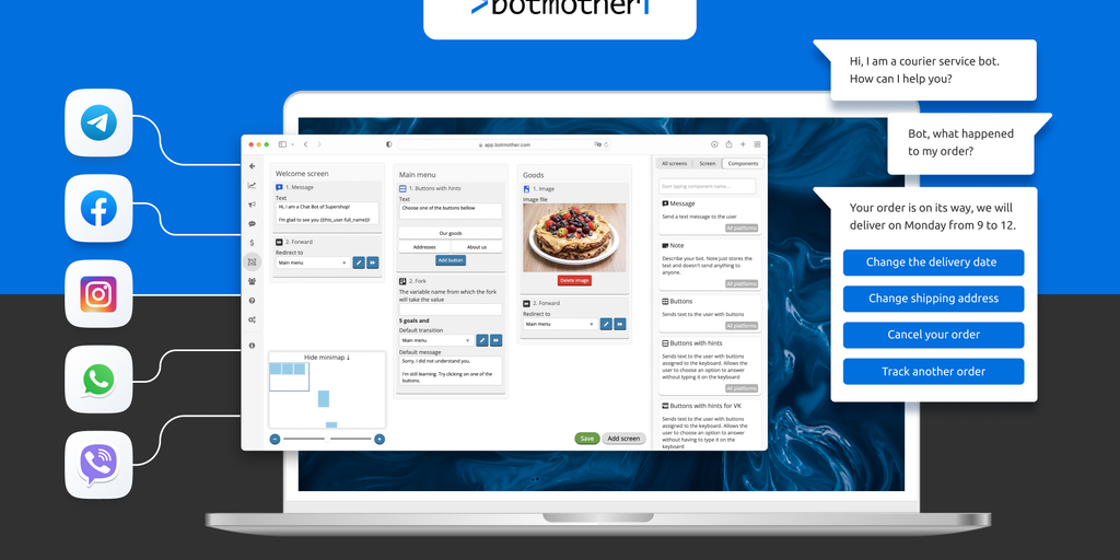 An all-in-one platform that enables users without any programming skills to build a chatbot for popular social media platforms, including Telegram, Facebook Messenger, Instagram, WhatsApp, and Viber.