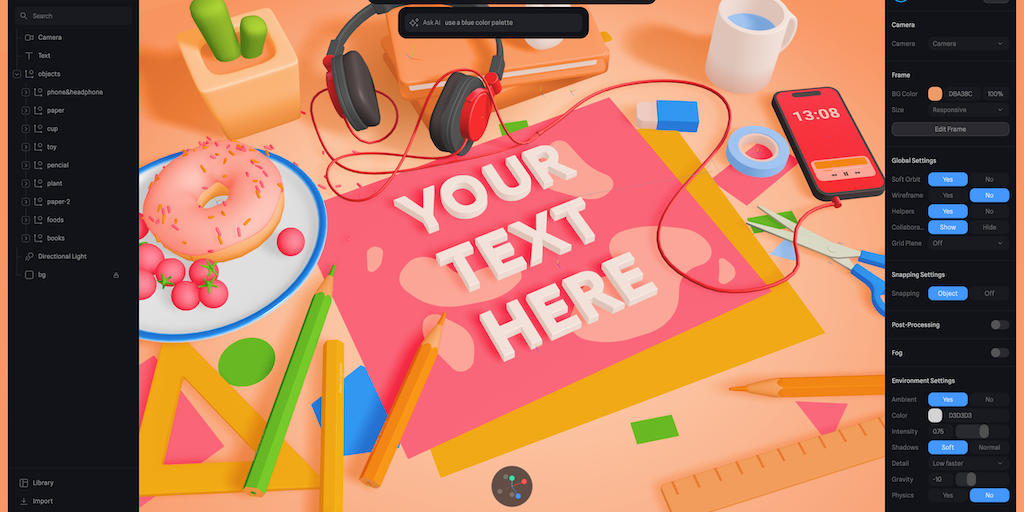 Spline AI is a new way to design and collaborate in 3d while using AI. 🔮Create objects/scenes, 📸 animate, 🏓 add physics, 🕹️brainstorm ideas, 🎨change colors/materials, 🌈generate style alternatives, and