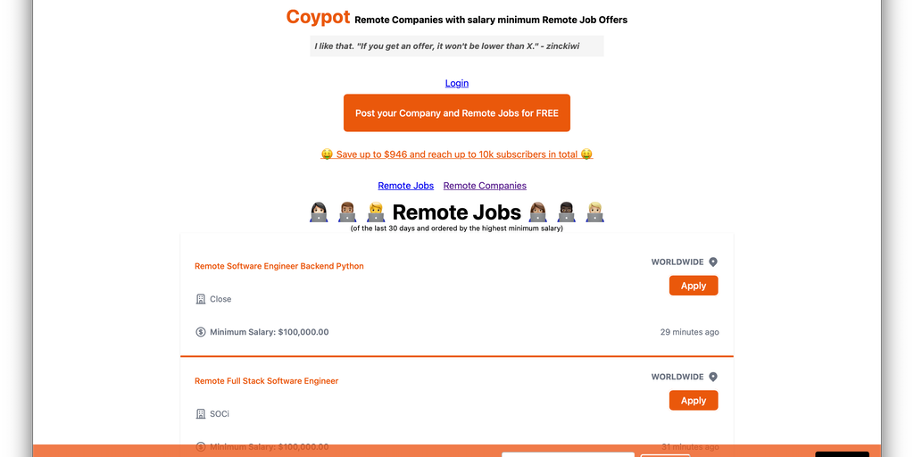 Coypot.com is all about the highest paid minimum salary remote jobs. The higher your minimum salary, the higher the job post gets ranked. The higher the lowest minimum salary remote job of your compan