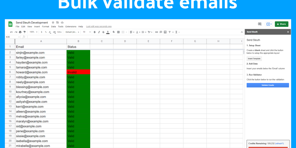 Send Sleuth makes it easy to validate and verify emails. Just enter a list of emails and start the add-on to have them all verified. Our add-on uses many indicators to verify the validity of an email