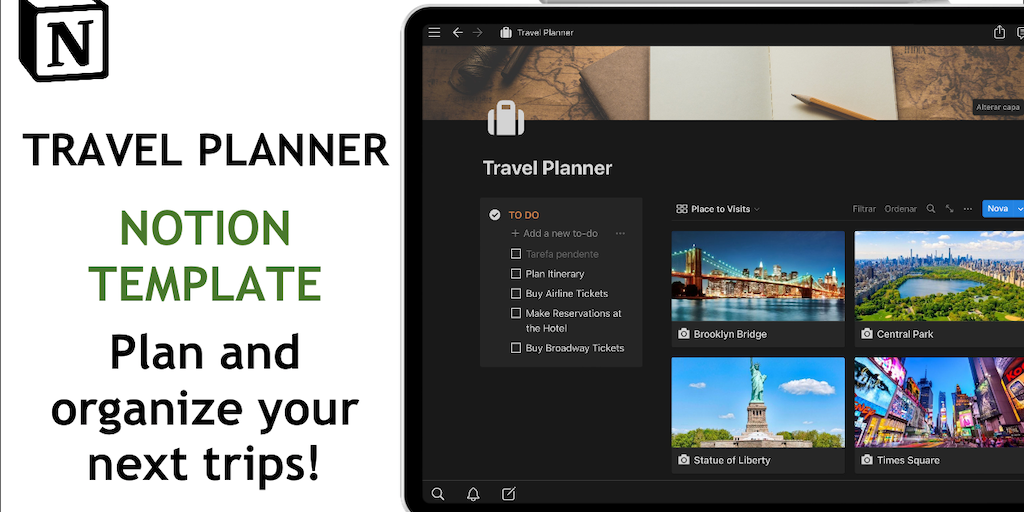 Plan and organize your next trips with this Notion Template! Make a checklist of the organization of your trip, register photos and information about sights, organize your daily schedule of tours.