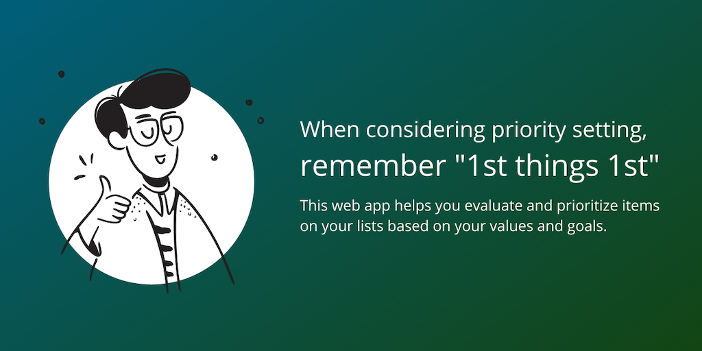 When considering priority setting, remember "1st things 1st". This web app comes with two prioritization tools: "intuitive" based on gut feeling and "smart" based on analysis of your options. Moreover