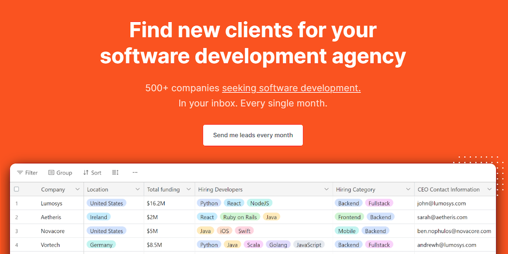 Discover companies seeking software development. Fresh new leads every month, right in your inbox.