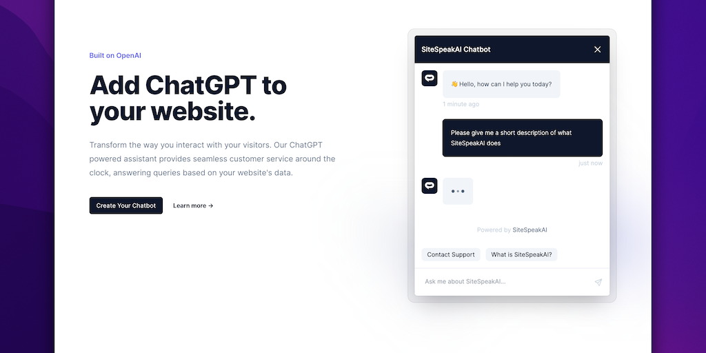 SiteSpeakAI lets you embed a ChatGPT powered chatbot on your website in seconds. Trained on your website data, the chatbot can answer questions about your website and products in realtime, 24/7.