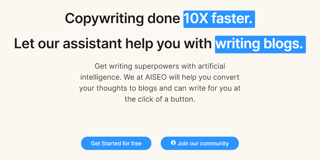 Copywriting done 10X faster. Let our assistant help you with Get writing superpowers with artificial intelligence. We at AISEO will help you convert your thoughts to blogs and can write for you at the