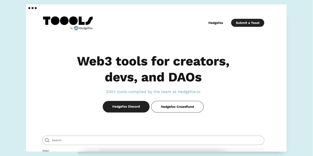 Toools is a searchable and filterable list of over 300 web3 tools specifically for creators, developers, and DAOs. You won't find investment protocols or specific coins here. These projects are strict