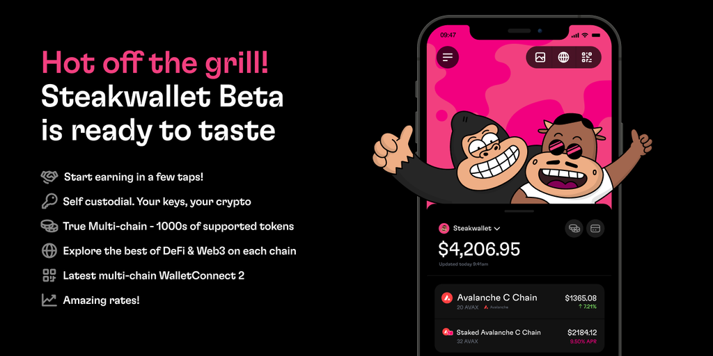 Steakwallet is the only wallet you will ever need for Web 3: one key for all chains, tasty yields in-app via staking and yield vaults, multi-chain NFT support, crypto purchases via Apple/Google Pay, a