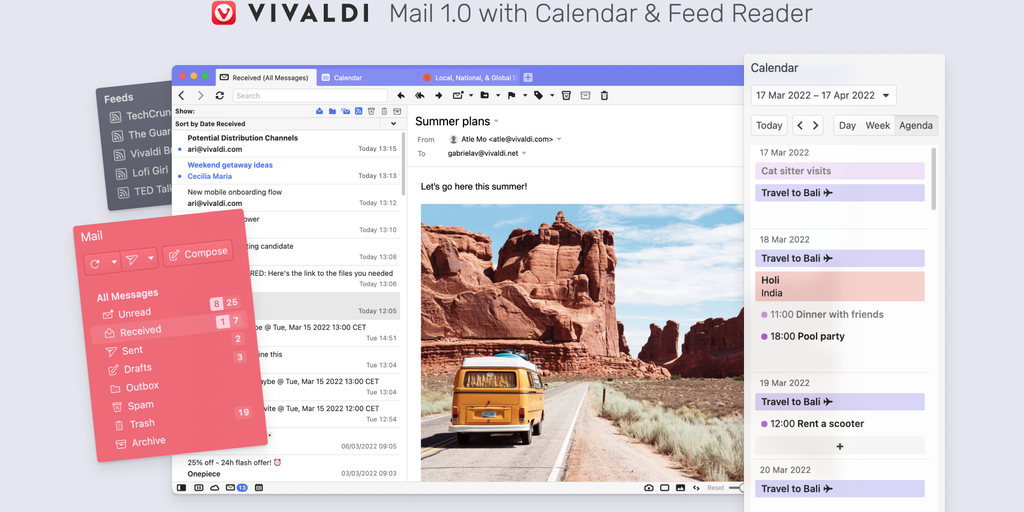 Meet Vivaldi Mail – a new, free email client from Vivaldi. It's built into your browser and lets you manage emails from multiple accounts, mailing lists, and feeds – all in one unified inbox.