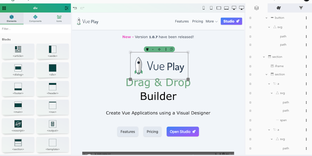Create And Design Vue.js Files With Less Code Using Transform Tools And Style Controllers. Drag & Drop Elements And Components Into The Playground With Vue Play. Re-Use Components And Deploy A Website