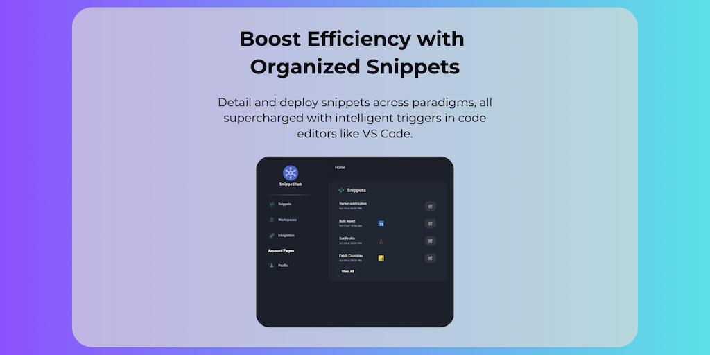 Easily store, manage, and use code snippets with SnippetHub. Dive into innovation without the hassle of repetition.