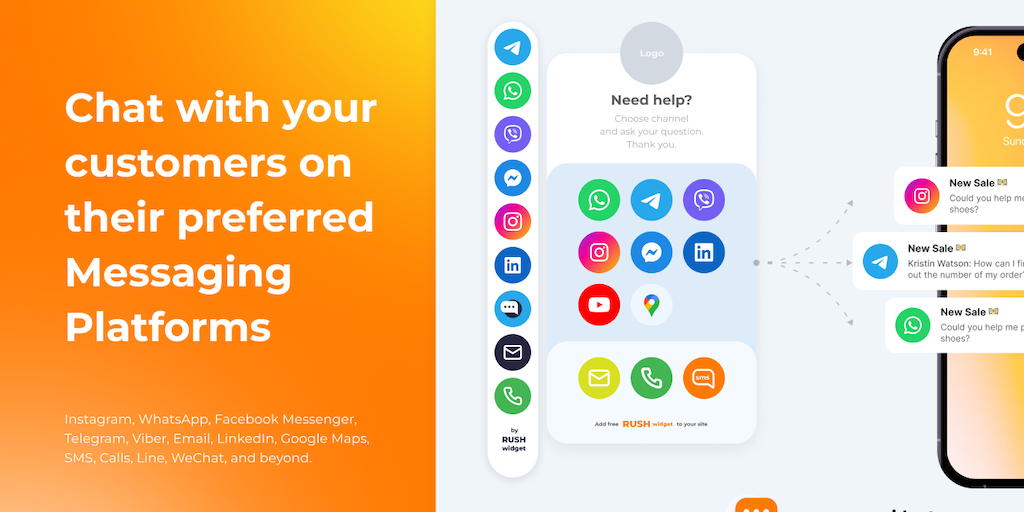 💡 Rush widget displays an all-in-one multifunctional messaging button on every page of your site to chat with your customers on their preferred channels.