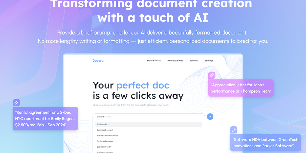 Docera is a tool that turns brief prompts into beautifully crafted documents for professional and personal needs, saving both formatting and writing time.