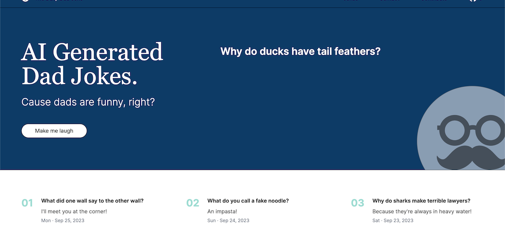 One joke a day, told by a dad, that can be funny (sometimes). The Daily Dad Joke shows one joke a day, based on question and answer, generated by AI that simulates being a dad.