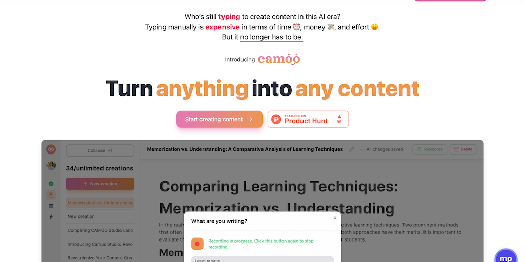 Who’s still typing to create content in this AI era? Typing manually is expensive in terms of time ⏰, money 💸, and effort 😫. But it no longer has to be. CAMOO can help you turn your voice/ thoughts/ f