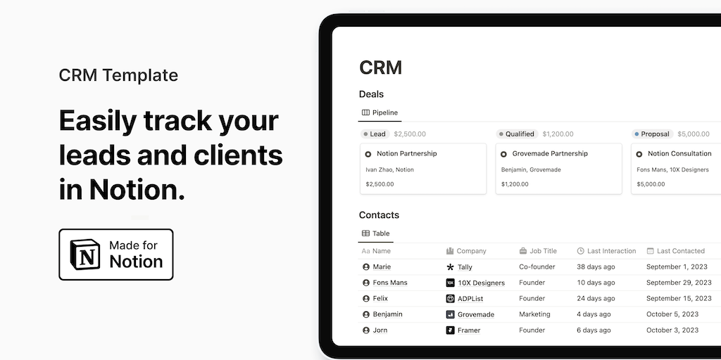 A simple Notion template to easily track all your leads and clients in Notion.