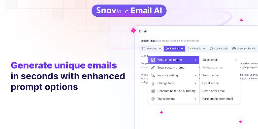 Get more opens, clicks, replies and bookings with Snov.io Email AI assistant. Creating an email is now fast and easy, even if you have no copywriting skills. Email AI uses unique prompt enhancers deve