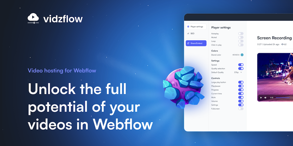 Vidzflow is a better and faster video hosting for Webflow. Escape the black hole of video compression, size limits and cluttered video players. It's fully customizable, optimized for performance and r