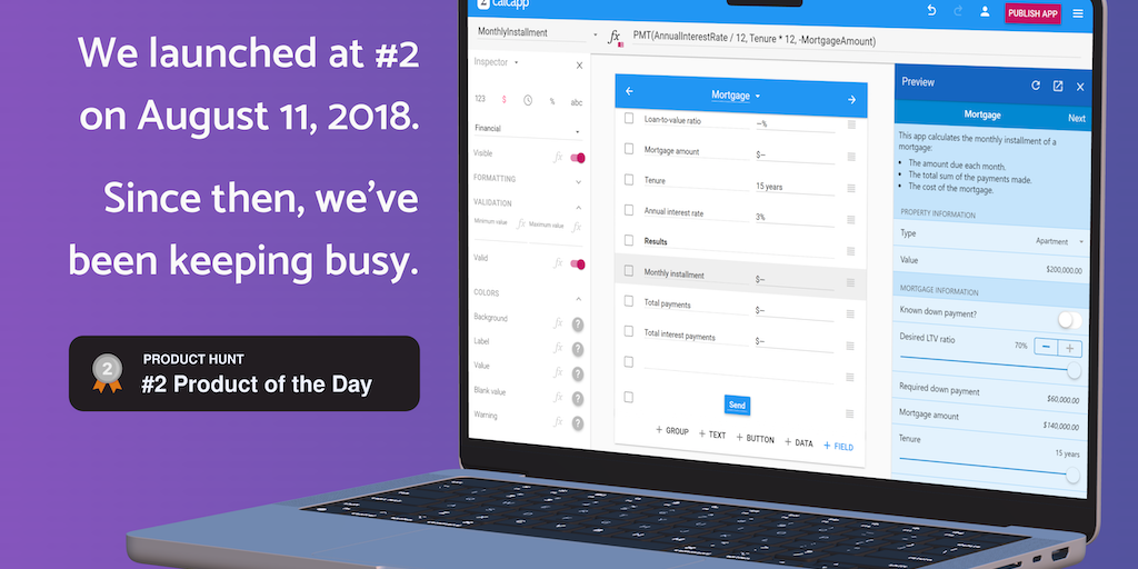 🚀 Grateful for the #2 launch 5 years ago (to the day!), enabling me to work full-time on Calcapp! Our release today adds powerful action formulas, a tabular data editor and 11 types of buttons to Calc