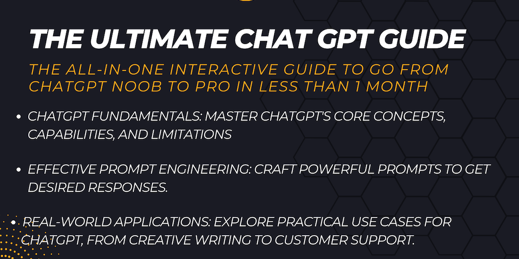 The Ultimate ChatGPT Guide! 🚀 - Uncover ChatGPT fundamentals: architecture, capabilities, limitations. - Master prompt engineering: effective prompts, context, control codes. - Explore real-world Chat