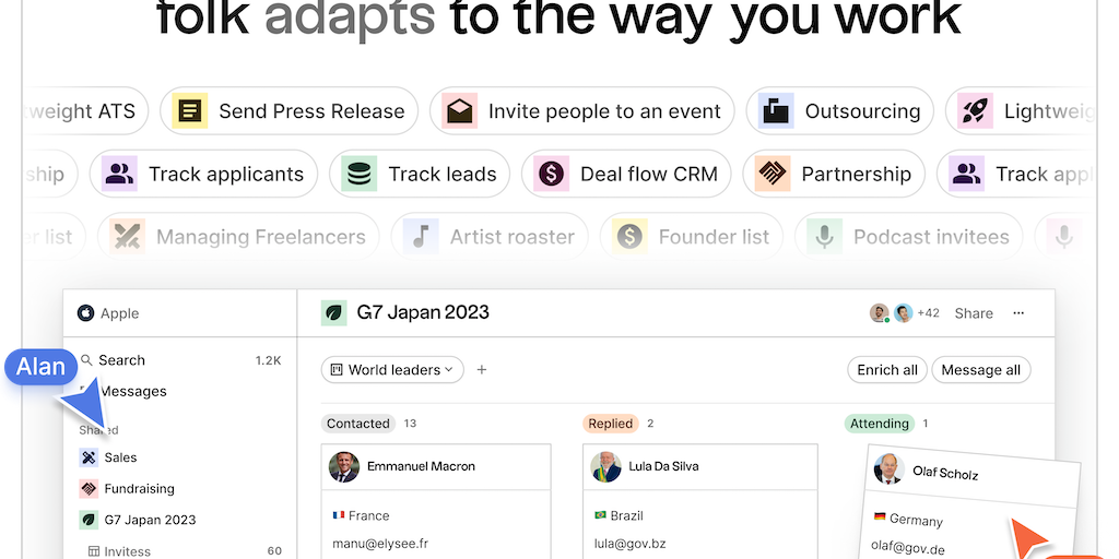 folk is the CRM that works for you, not the other way around. It’s lightweight, customizable, and powered with AI to let you easily build stronger relationships.