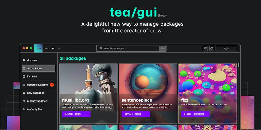 Introducing tea – the revolutionary, cross-platform, package manager. Automate dependencies and browse through hundreds of packages seamlessly. Say goodbye to slow & clunky, and say hello to fast & sm