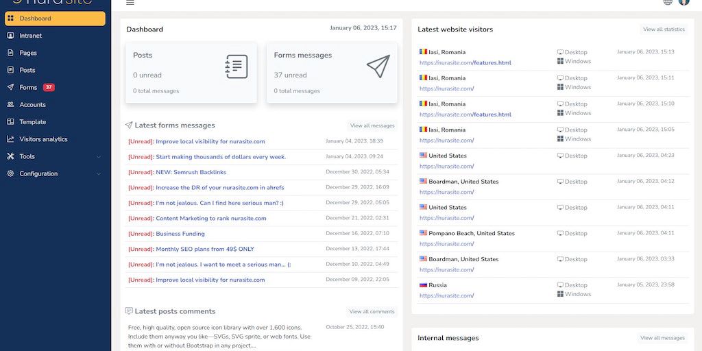 Nura Website Builder allows you to create a website without coding experience. Features: multi-lingual website builder, content management system, online forms builder, advanced custom fields, contact