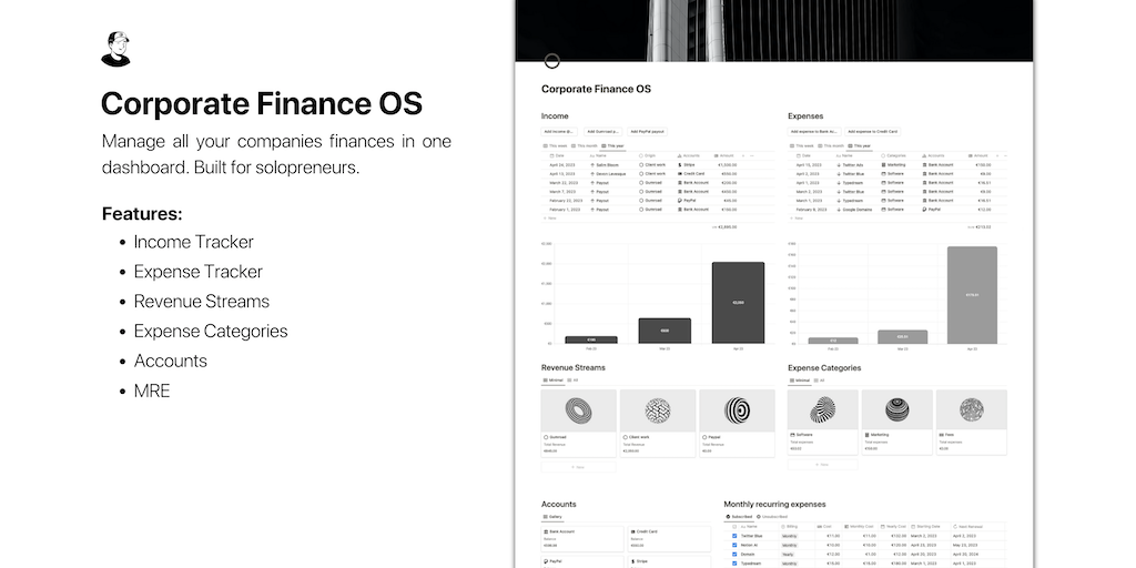This template is a finance system built in Notion. It was specifically designed for solopreneurs, but can be useful for every sort of entrepreneur & business. Track your profits, subscriptions & diffe
