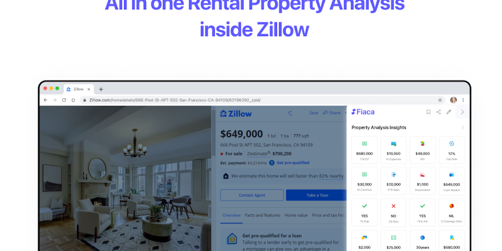 Calculate cap rate, mortgage payment, monthly cash flow, net operating income, closing costs, 1% rule all inside Zillow. Fiaca gives a powerful extension to instantly evaluate properties inside Zillow