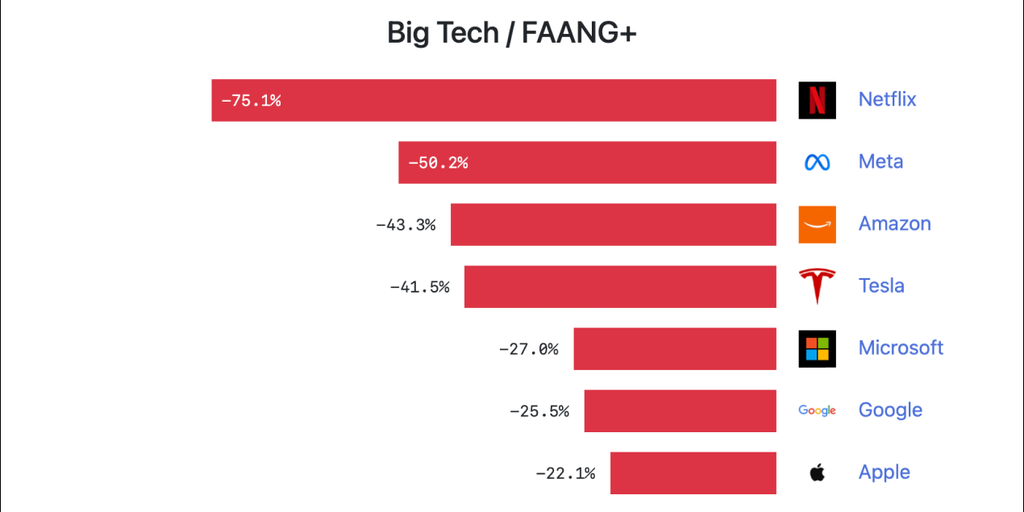 Tracker of tech companies whose stock prices are down the most from their recent highs. The average public tech company's stock price is down 63.9% from from its 52-week high.