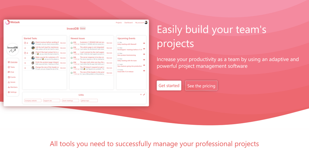 With Wetask, easily manage your team, projects, tasks, issues, events, files sharing and more. Free to-do list and productivity tracker included.