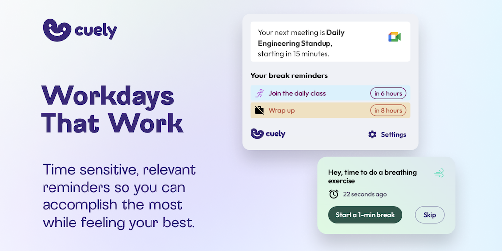 Are you forgetting to drink water, have lunch, stretch, or even go to the bathroom on work days? You're not alone! We created Cuely to remind ourselves to be more mindful of our well-being, which is u