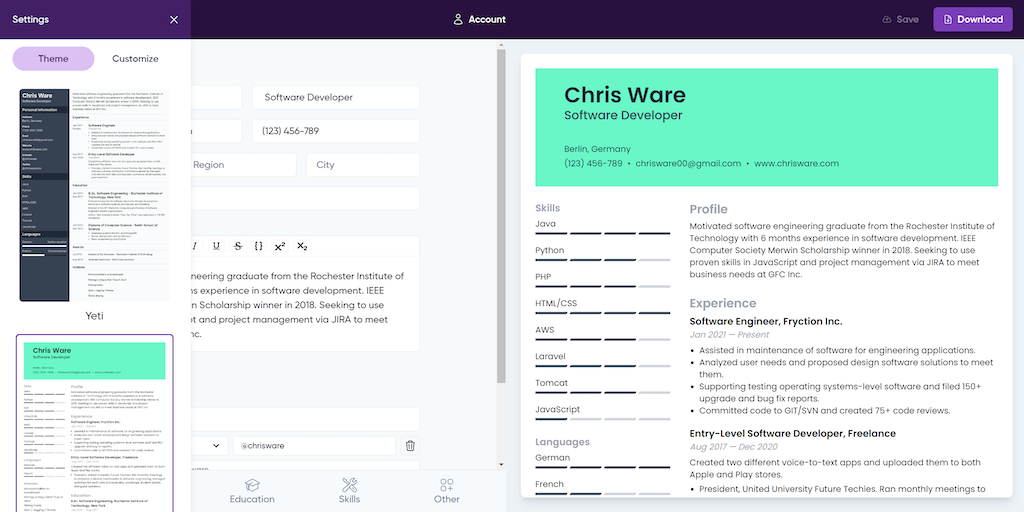 ResumeTide is an easy-to-use, no-gimmicks, Resume builder. Coupled with multiple good-looking themes, make your next Resume with a Resume builder that won't bankrupt you.