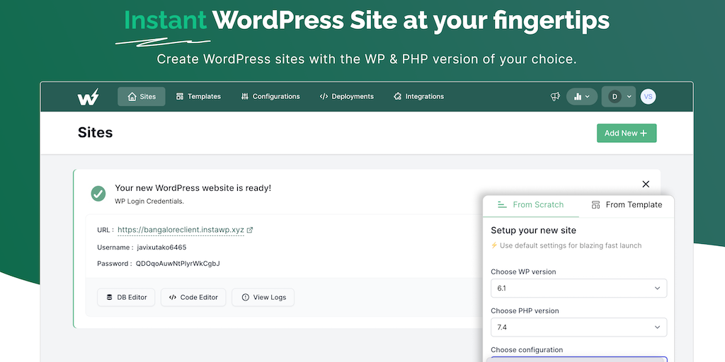 InstaWP is an all-in-one WordPress development toolset to launch instant WordPress sites with zero setup time. 1-click staging, db editor, code editor, WP-CLI, product sandbox all inside your browser.