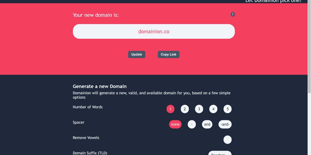 Domainion - Stuck for a domain name? Let Domainion pick one! | Product Hunt