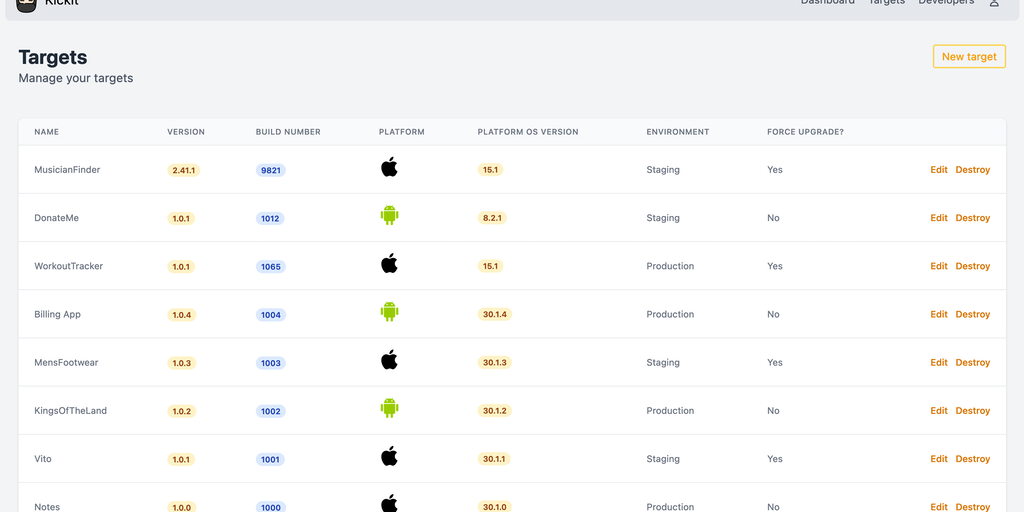 KickIt is a service that allows application developers to inform users when they should do a version upgrade. They can target applications by name version, platform, environment and even force users t