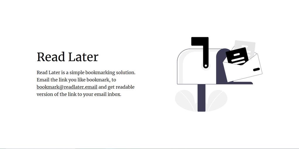 Read Later is a simple bookmarking solution. Email the link you like to bookmark, to bookmark@readlater.email and get the readable version of the link to your email inbox.