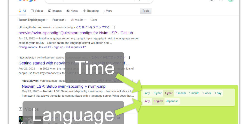 Choomame adds the following link to the Google search results. Time: restrict results to a specific time period (3 years, 1 month,..) Language: restrict results to a specific language (English, Japane
