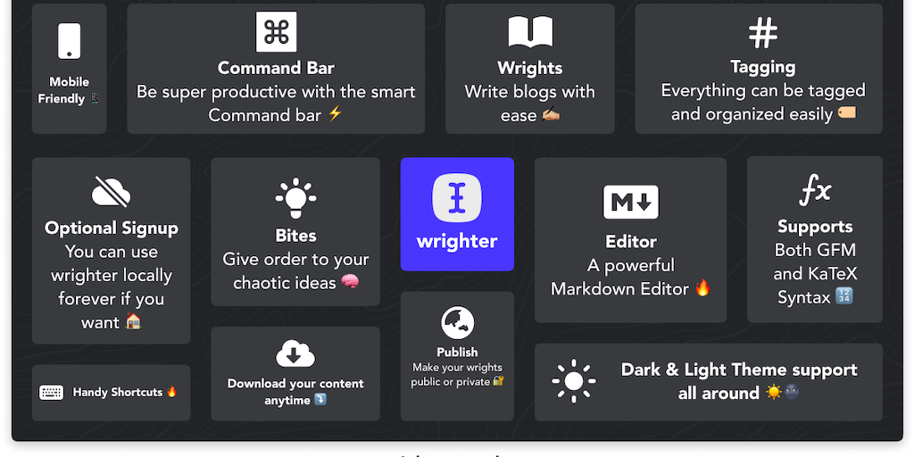 wrighter is a modern WYSIWYM #tag based markdown editor on the web. wrighter's "bites" help you manage unorganised thoughts which you can later use while writing, you can use wrighter to even publish