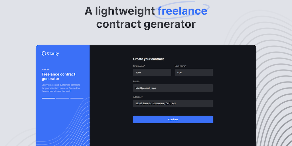 Clarity is a lightweight contract generator for freelancer. Easily generate a contract for free in under 2 minutes.