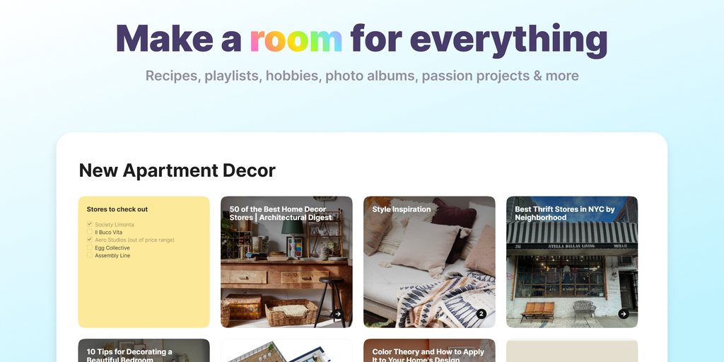 Bleep is the virtual home for all your thoughts and inspirations. Add notes, images & links to capture what's on your mind. Create rooms to organize and curate them. Enjoy a fun, visual space that's t