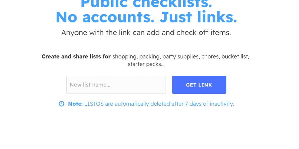 Create public checklists with a click. Anyone with the link can add and check off items. Lists are automatically deleted after 7 days of inactivity. Great for shopping lists, chores, feedback, etc...